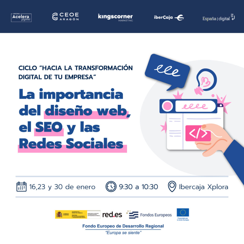 Este ciclo se compone de 3 sesiones formativas, cada una destinada a brindar las claves fundamentales básicas para construir y mantener una consolidada presencia online, para el impulso de tu transformación digital, en colaboración con nuestros socios especializados de KINGS CORNER, en el magnífico espacio XPLORA de IBERCAJA, Zaragoza.
