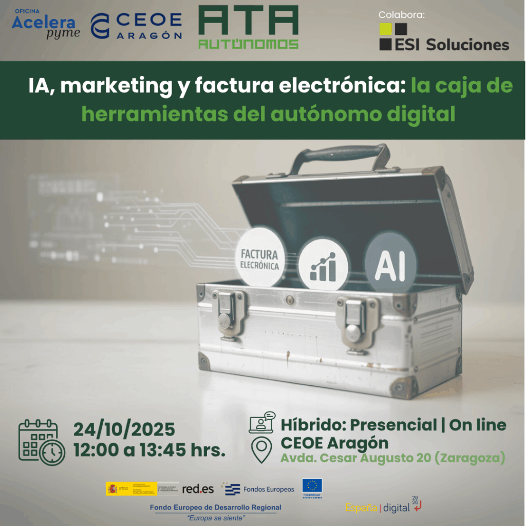 La digitalización ya no es una opción, también los autónomos necesitan adaptarse a un entorno cada vez más tecnológico para seguir siendo competitivos. En colaboración con la Asociación de Trabajadores Autónomos de Aragón (ATA) hemos preparado una sesión práctica pensada especialmente para ti, donde aprenderás de manera sencilla qué herramientas digitales pueden ayudarte en tu día a día. Además, conocerás experiencias reales de otros autónomos que ya han dado el salto a la digitalización y compartirán cómo lo han hecho. Durante la jornada también se presentarán los servicios de la Oficina de Impulso al Autónomo, pensados para acompañarte en tu camino empresarial.
